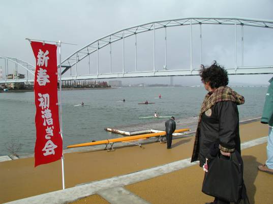 今年も琵琶湖の寒さは格別で2003年の初漕ぎ会は9:00に現役、若手(?)OBが準備体操後琵琶湖漕艇場に向けて出艇した。1年ぶりに艇庫に行くと護岸がコンクリートでしっかりと出来あがり雑草の生える余裕もなく様相が一変していた。何かかっての艇庫の自然なたたずまいからは想像できない人工的な且つ機能的に感ずる様相で、垂れ込めた雲とちらほらする雪との無機質な関係が何か何処かに大事なものを忘れ去られた現在の日本の社会を彷彿とさせた。恒例の通り現役諸君の努力によりアツアツのうどんと熱燗の酒で乾杯をし、現役・卒業年度の新しい順に自己紹介をした。同世代の子供を持つ私にとってみれば現役の諸君のしっかりした考え方に感動を覚え、又たった3人の部員でクラブ活動をすると言う困難さを痛感した。我々が現役の時代は艇の数が部員の数に全然足りず練習を何回かに分けて練習し又合宿所も1箇所では収容できず分けて合宿したこともあった。今はカナディアンもある為K-4も組めないペアさえも怪しい状況である。現在の学生気質かもしれないがクラブ活動(体育会)をする人たちはほんの一部で専門の人たちと言う感覚があるようだ。