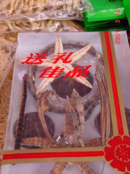 写真はヒトデを中心に、タツノオトシゴ、ヨウジウオ、ヘビ、ムカデが贈答品として、販売されていた。用途はおそらく精力をつけるものだと思われるが、とにかくすごく効きそう。