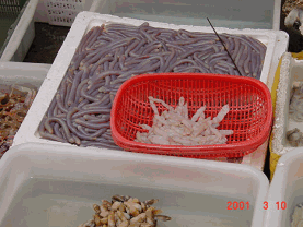 という言葉が中国にはあるらしいが、東門市場に行くと、畜肉のみならず、魚類、甲殻類、貝類等非常に多種多様な水産生物を食用、薬用に利用されていた。